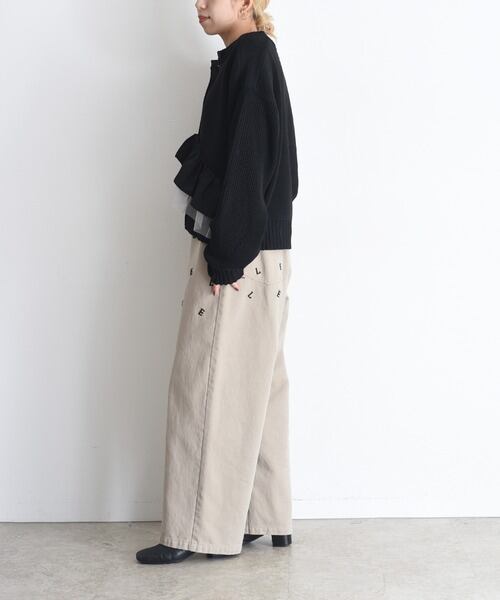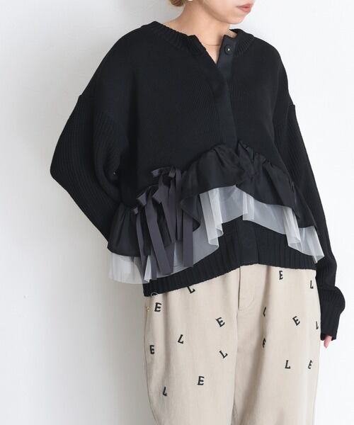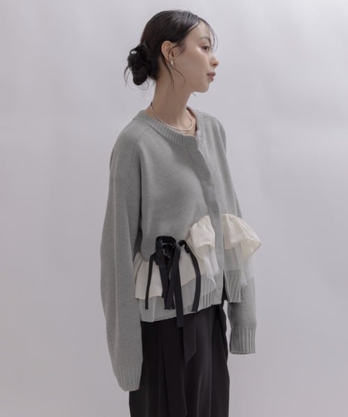 大胆なフリル使いにリボンをミックスした存在感抜群のカーデ。