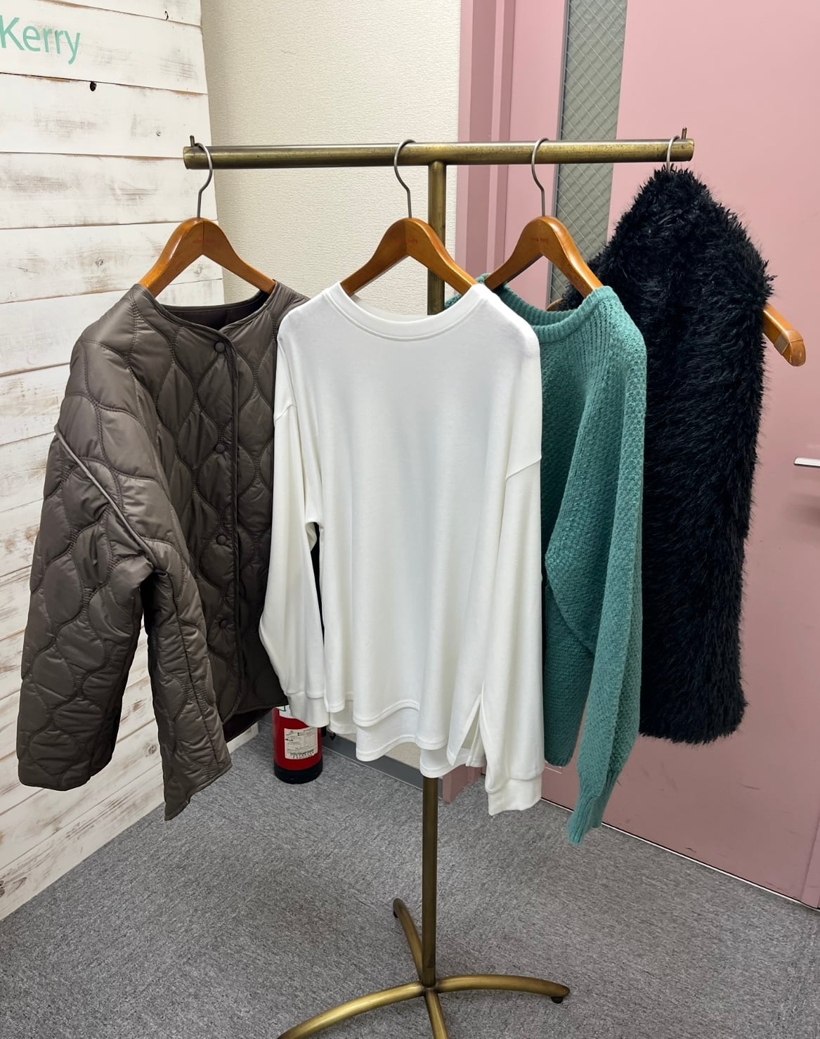 中綿コート、ニット、ロンT、エコファーストール、トートバッグの5点セット。