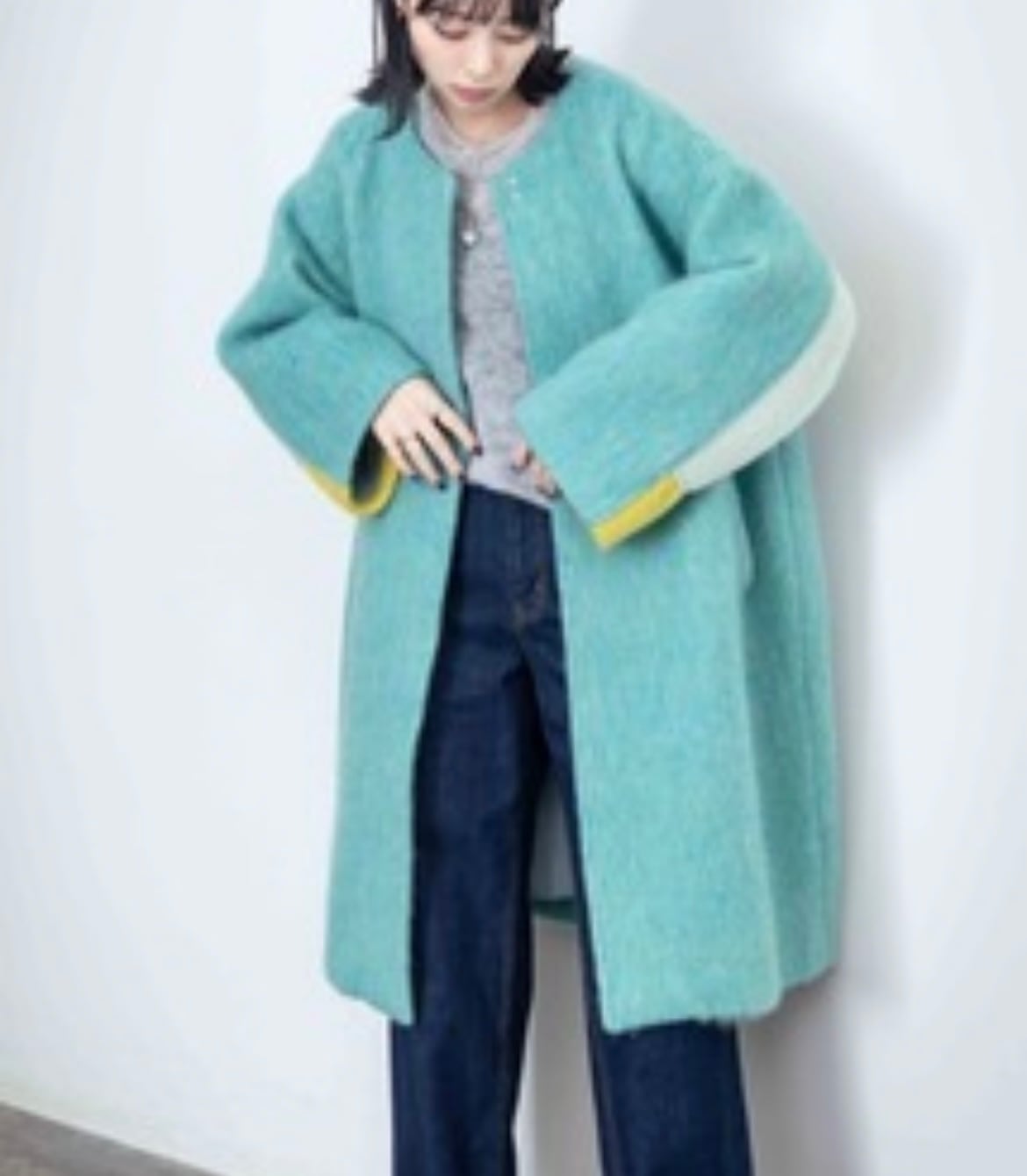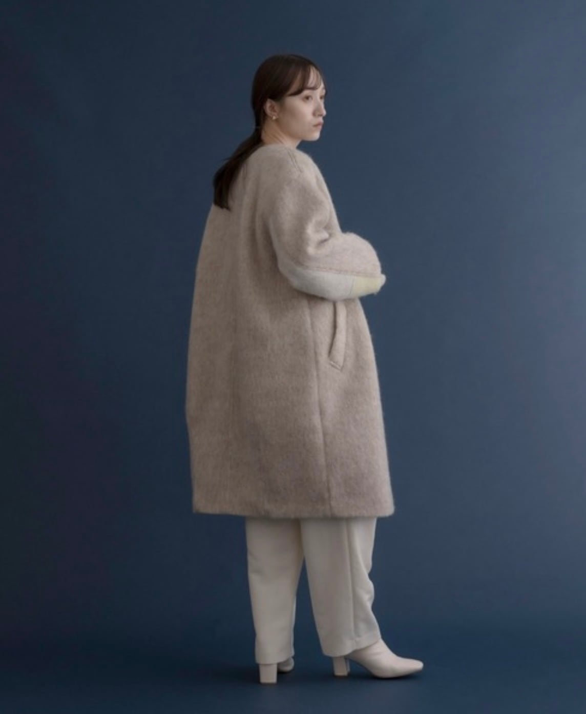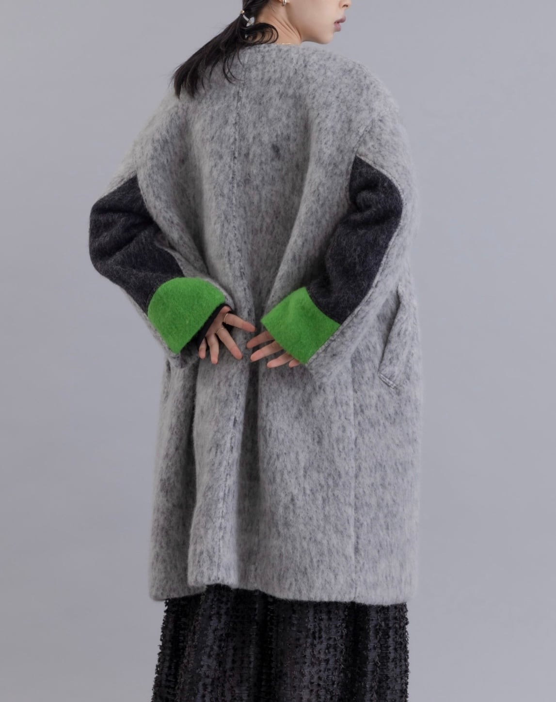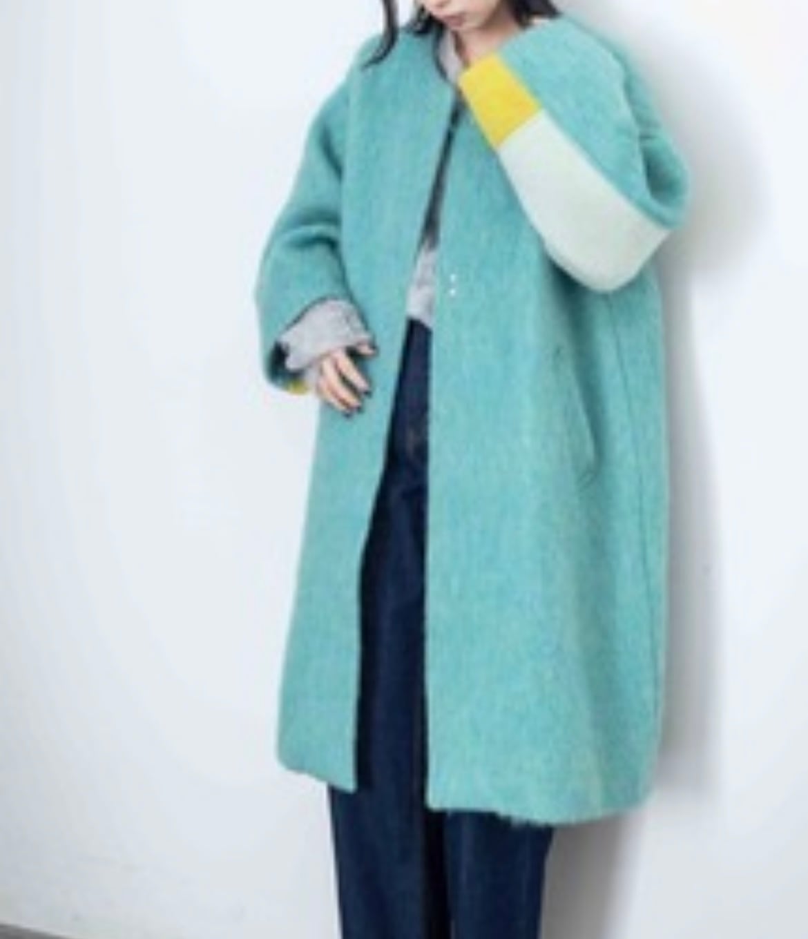 MIXCOLORの毛足ある素材が魅力的なウール混のコート。