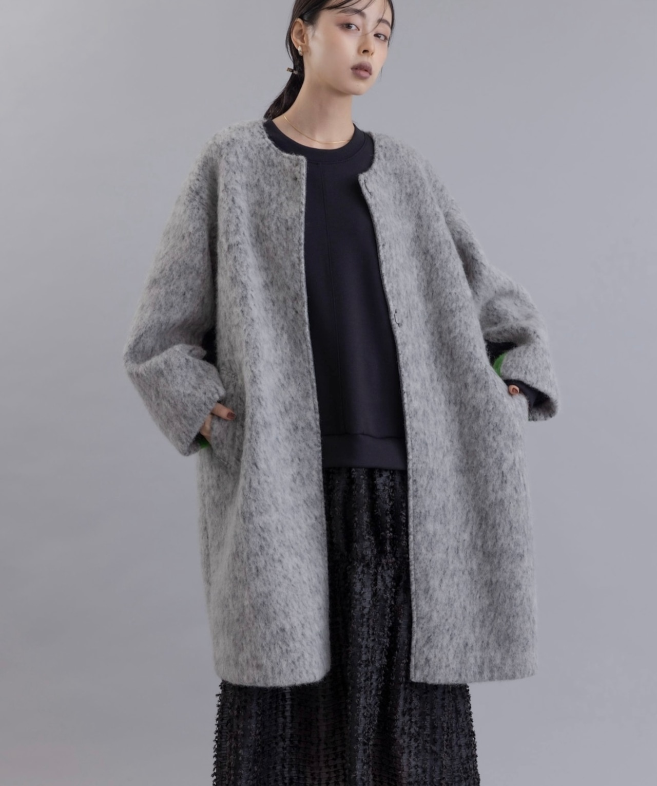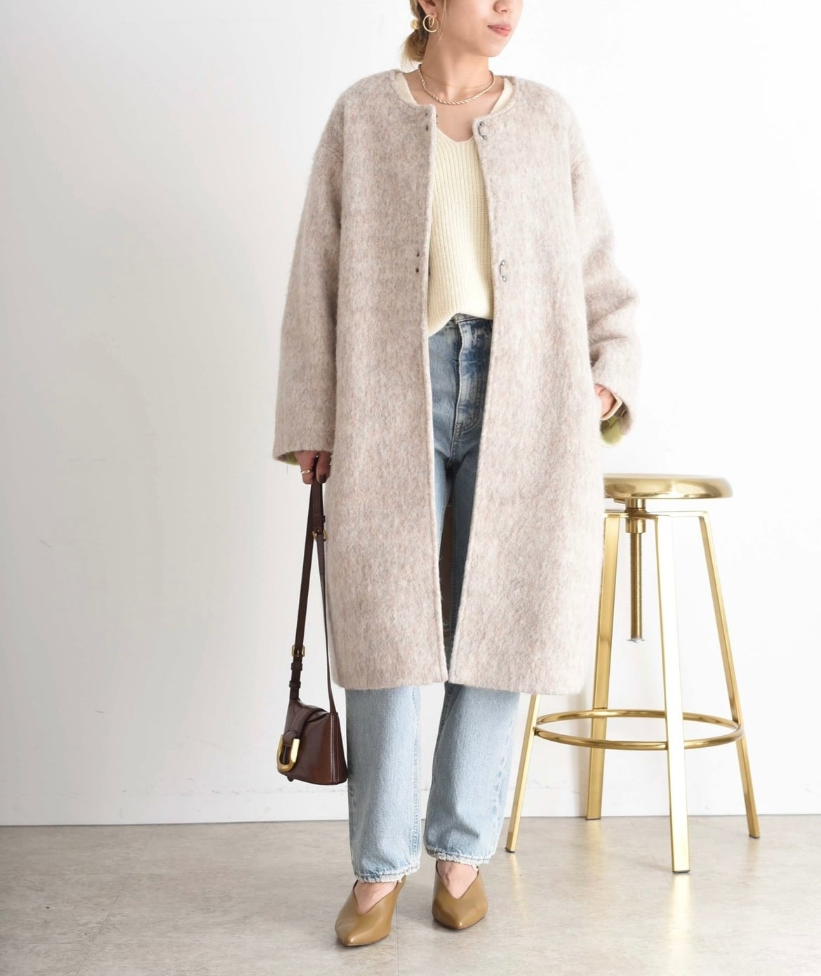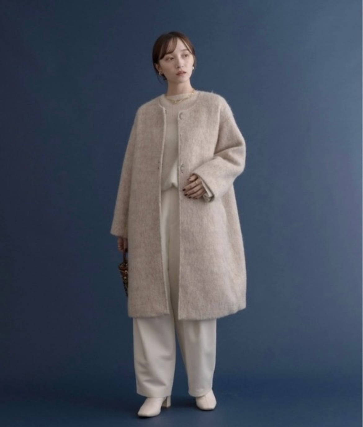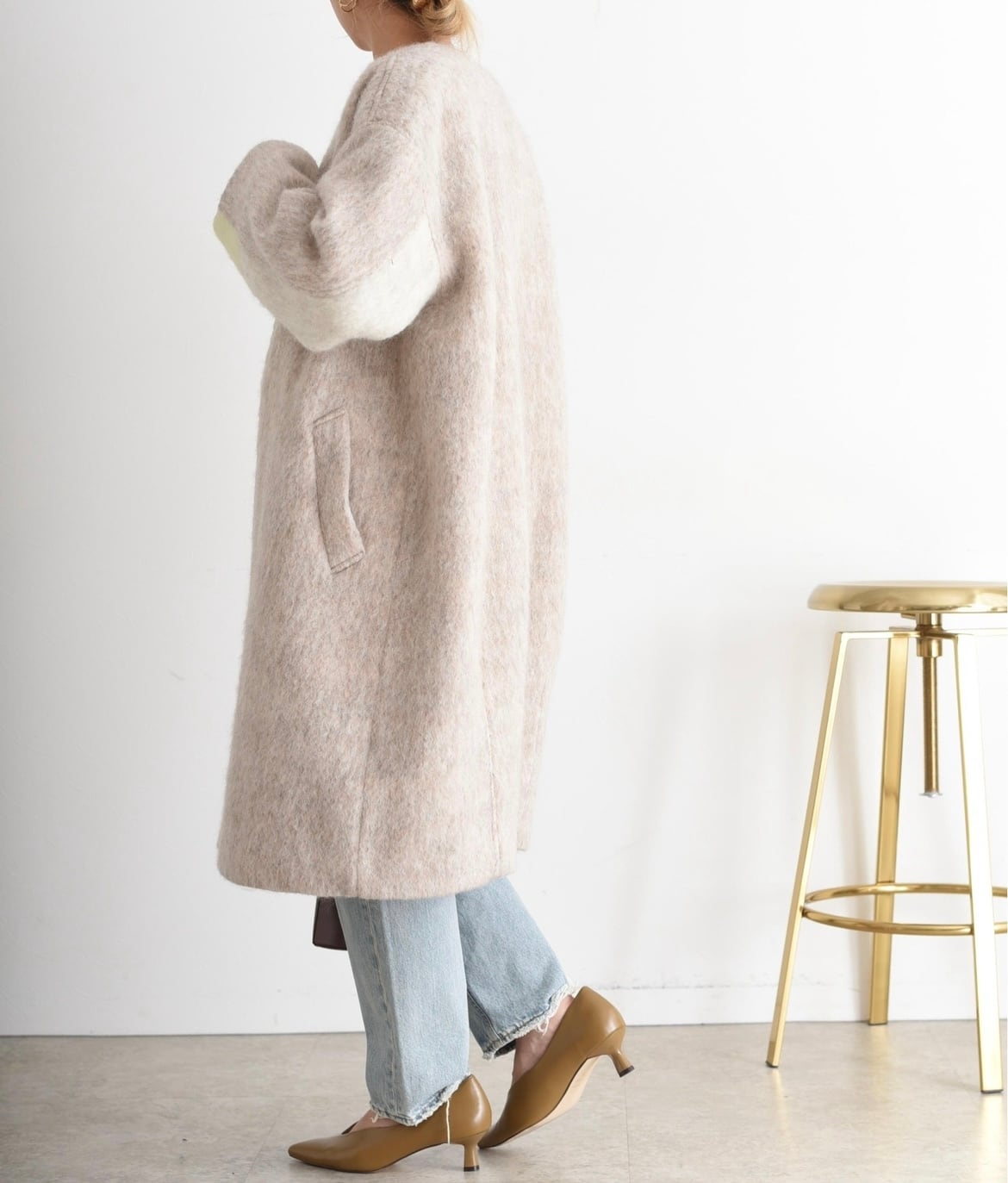 MIXCOLORの毛足ある素材が魅力的なウール混のコート。