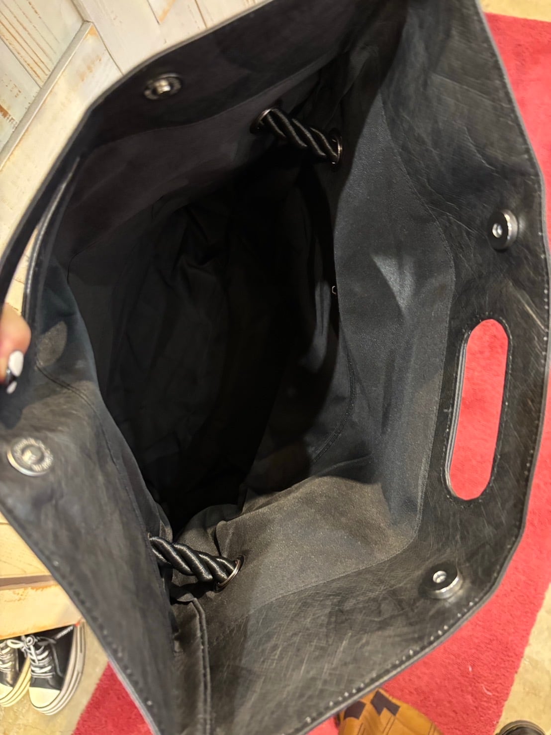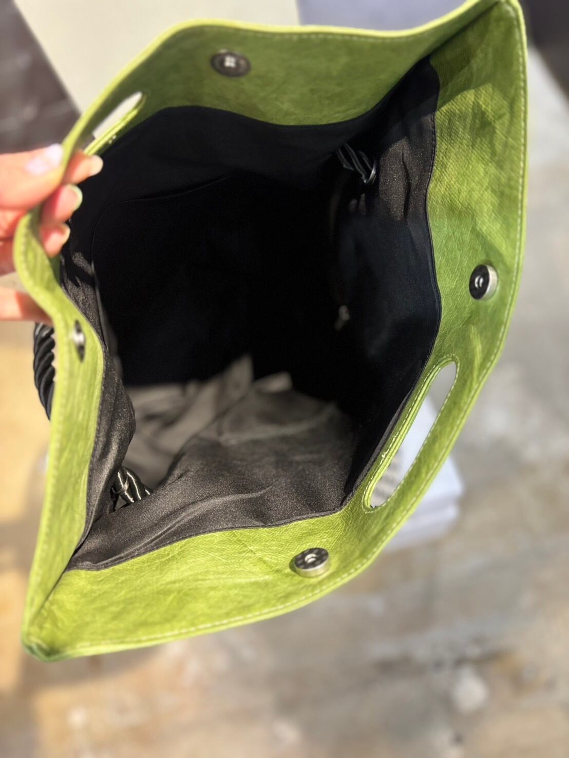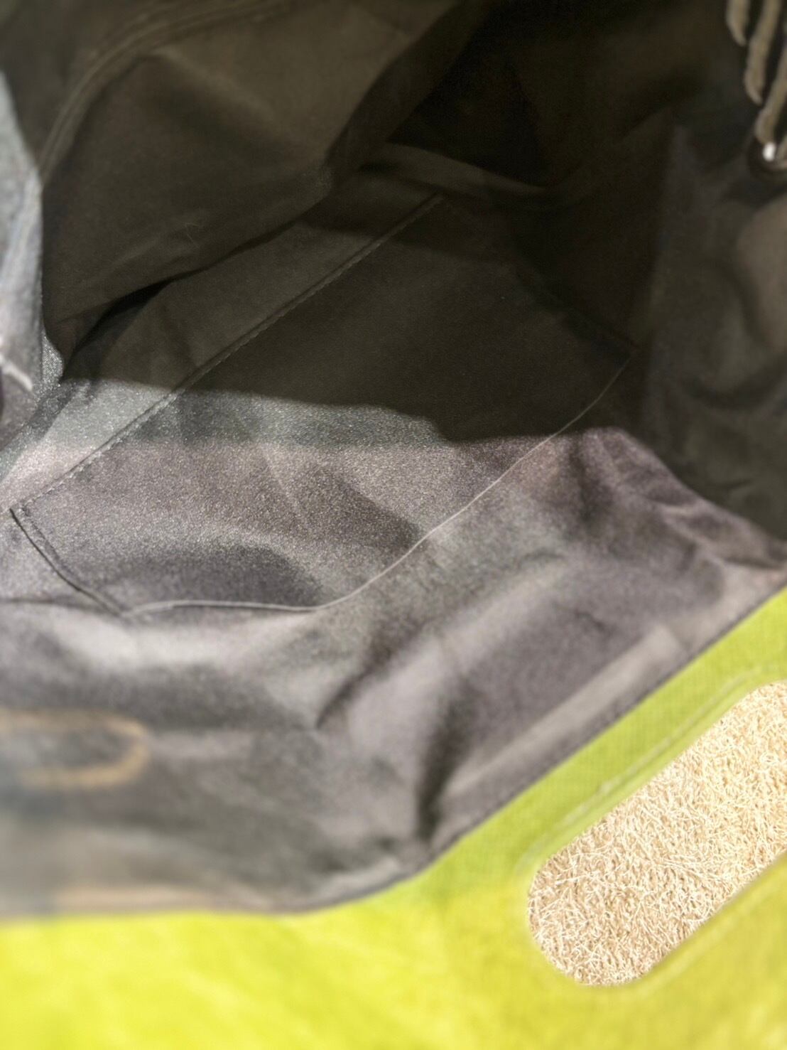 表財はシボ加工の強化ペーパー素材。内側には、ポリエステルの裏張りをした、しっかりした作りのバックです。