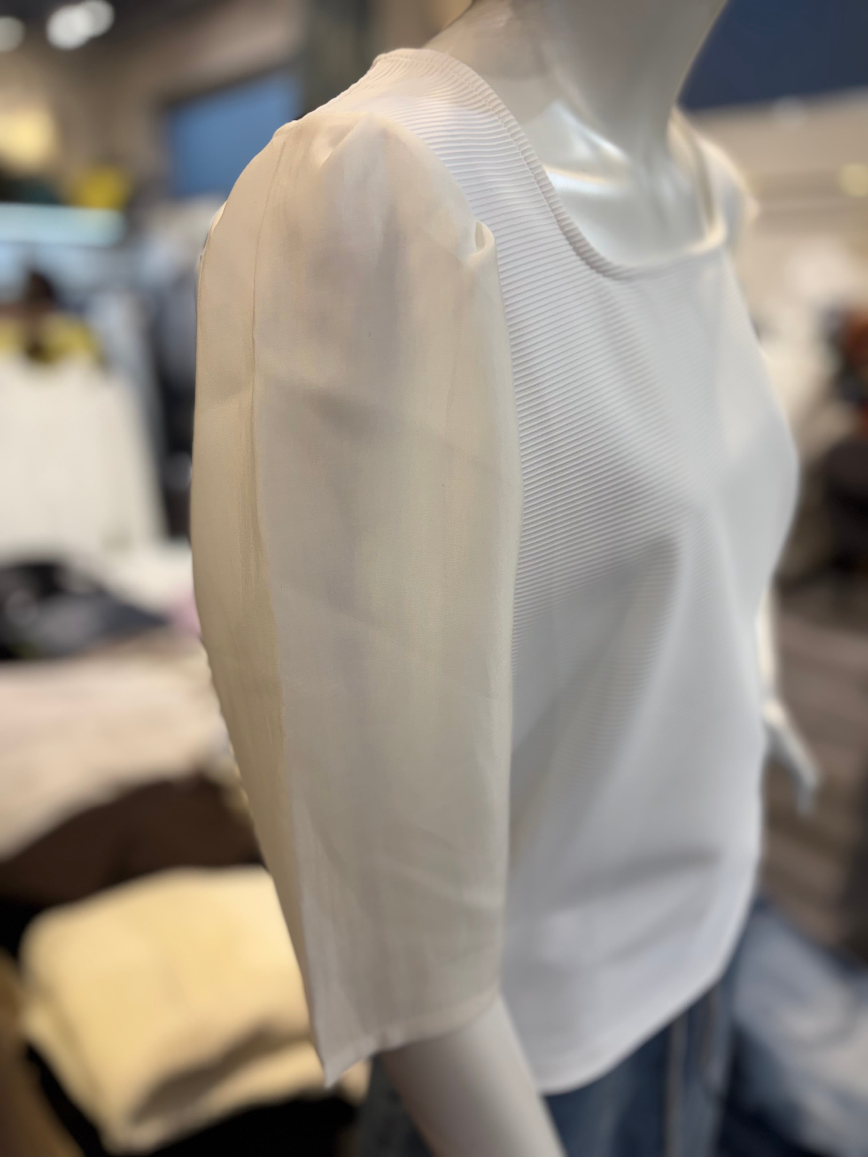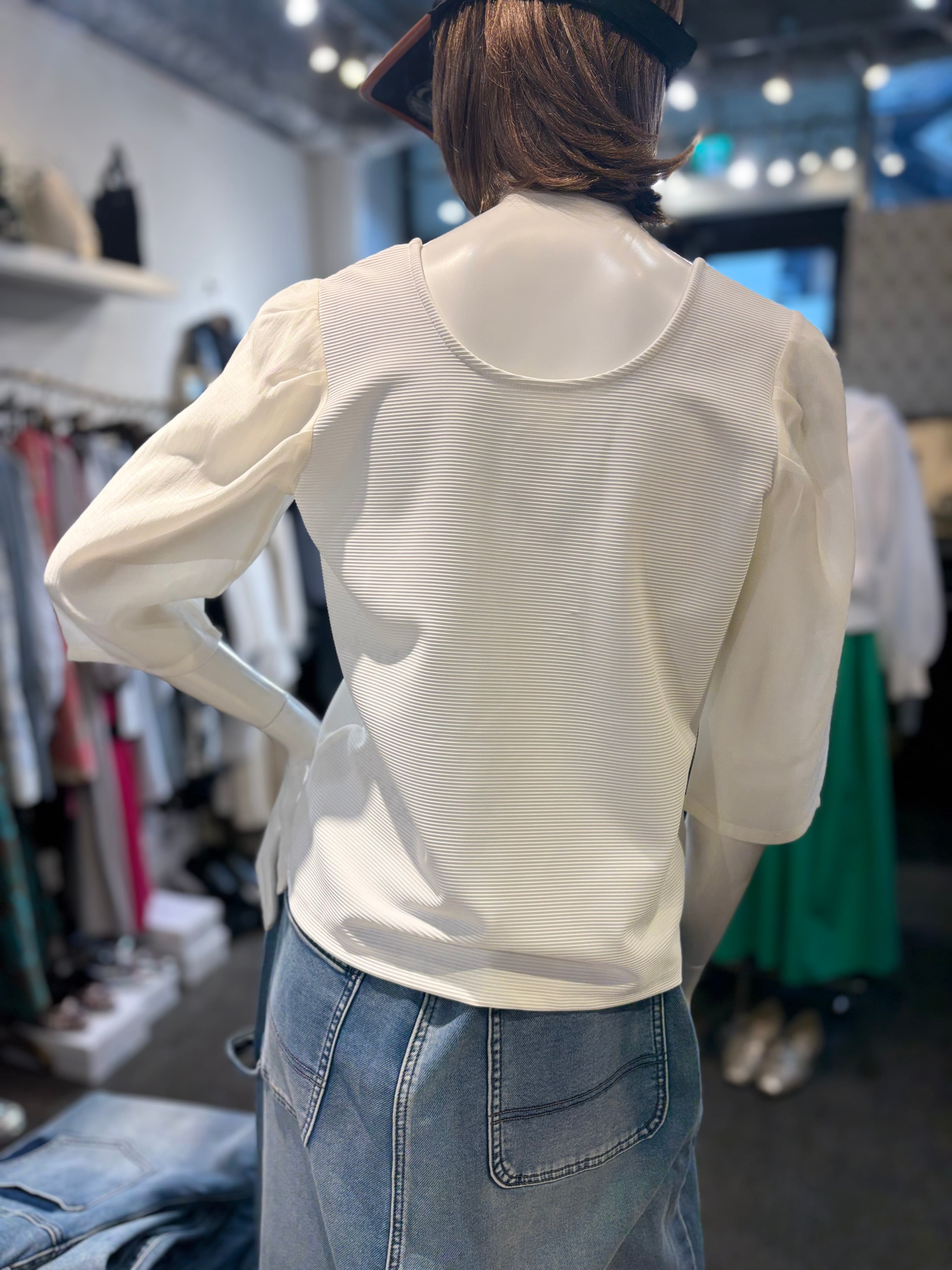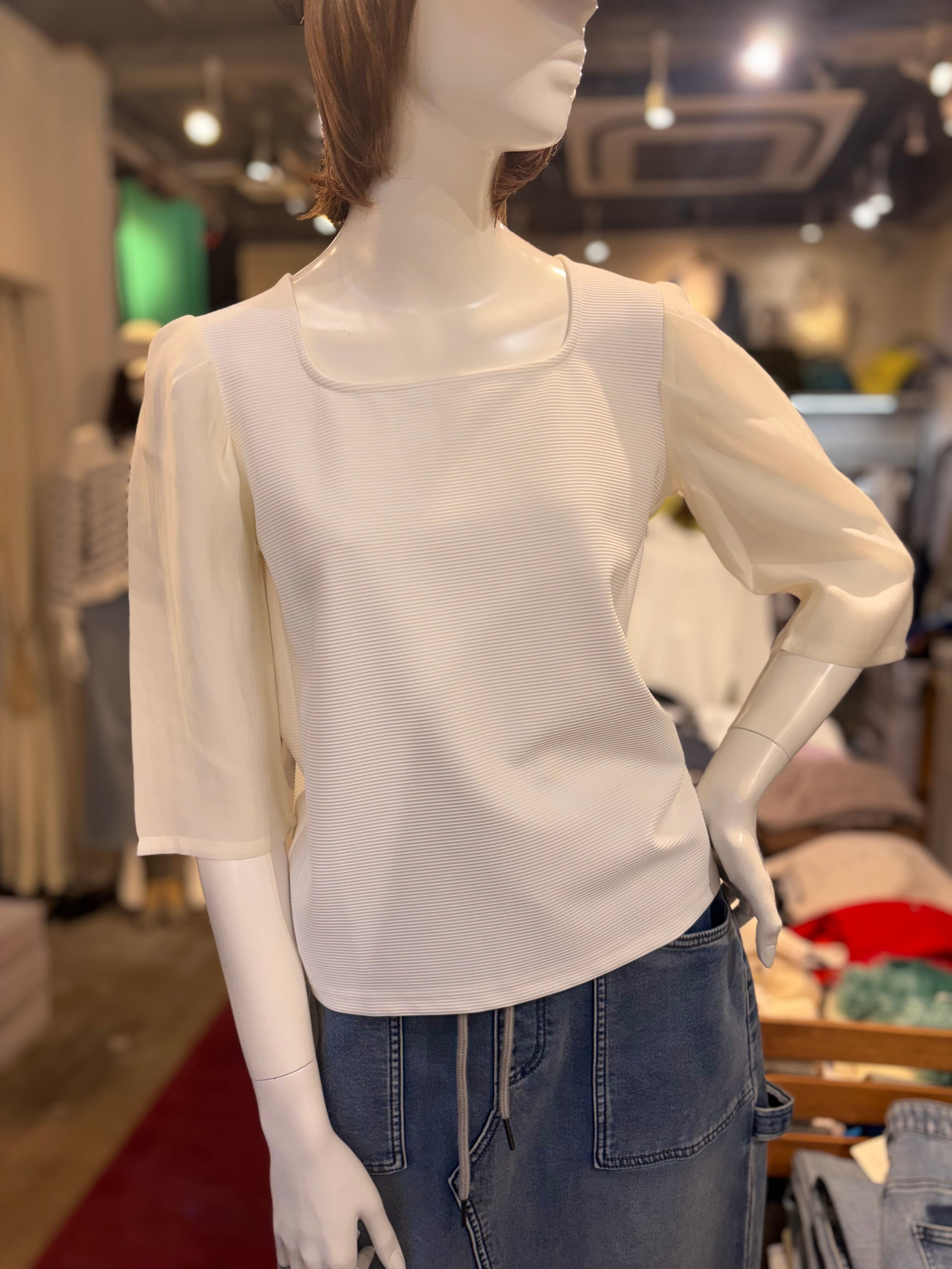 お袖にシアーなシフォン素材を使っておりますが、お洗濯してもシワにならず、とにかく文句無しに使えるトップスです。