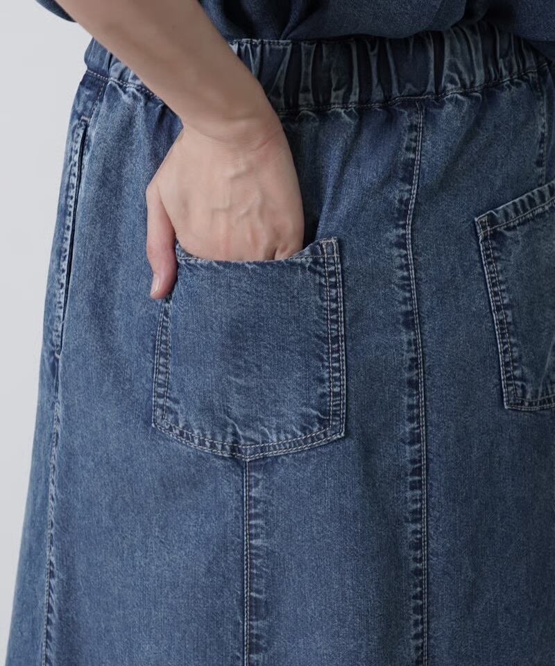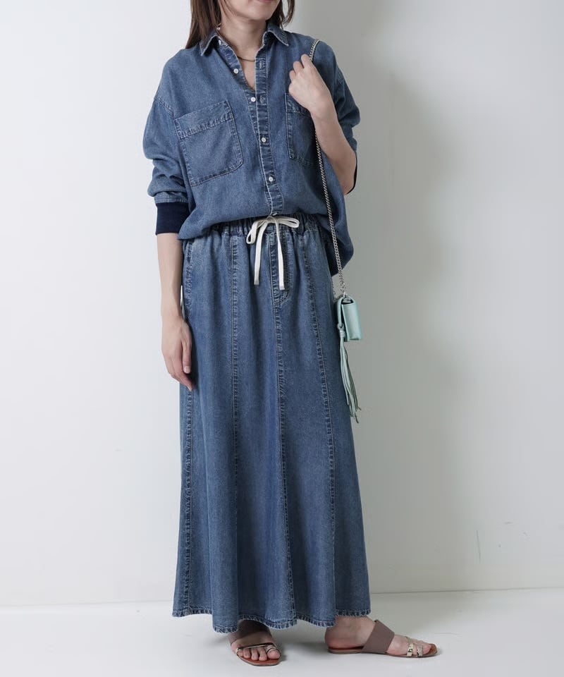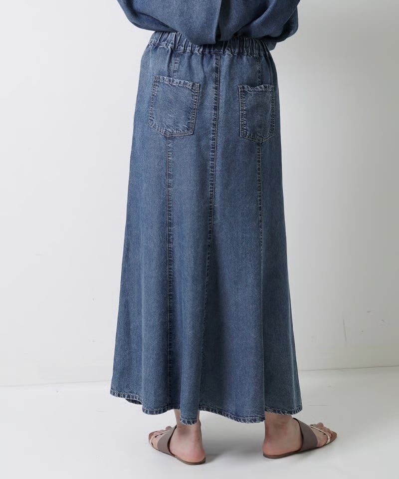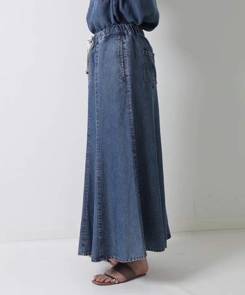 テンセルデニムを贅沢に使用したロングスカート。なめらかな肌触りと美しい光沢感が魅力です。8枚はぎによる優雅なドレープと、縦のラインを強調するロング丈がスタイルアップを実現。ウエスト部分のスピンドルでカジュアル感をプラス。同素材のシャツとのセットアップがおススメです。