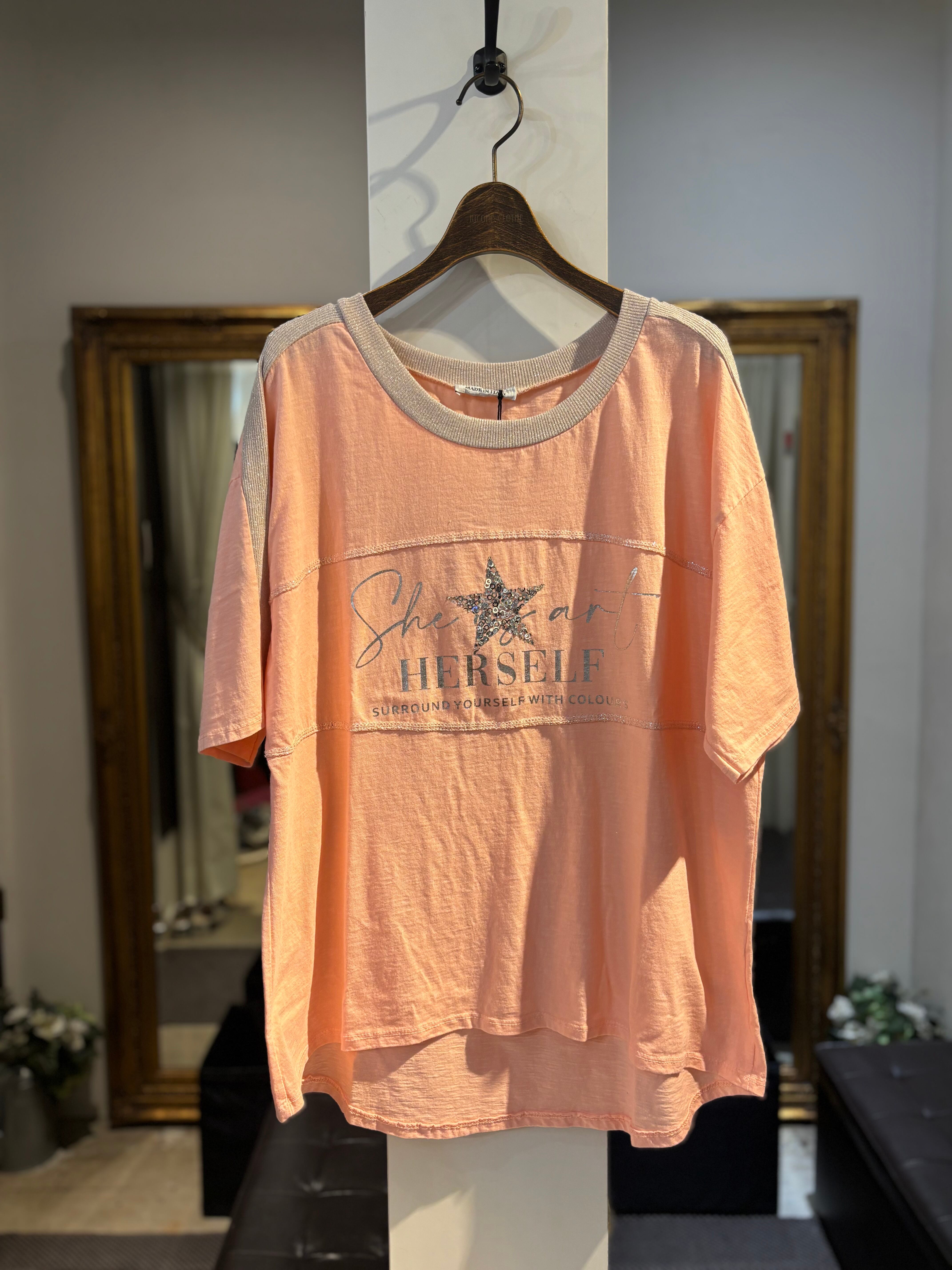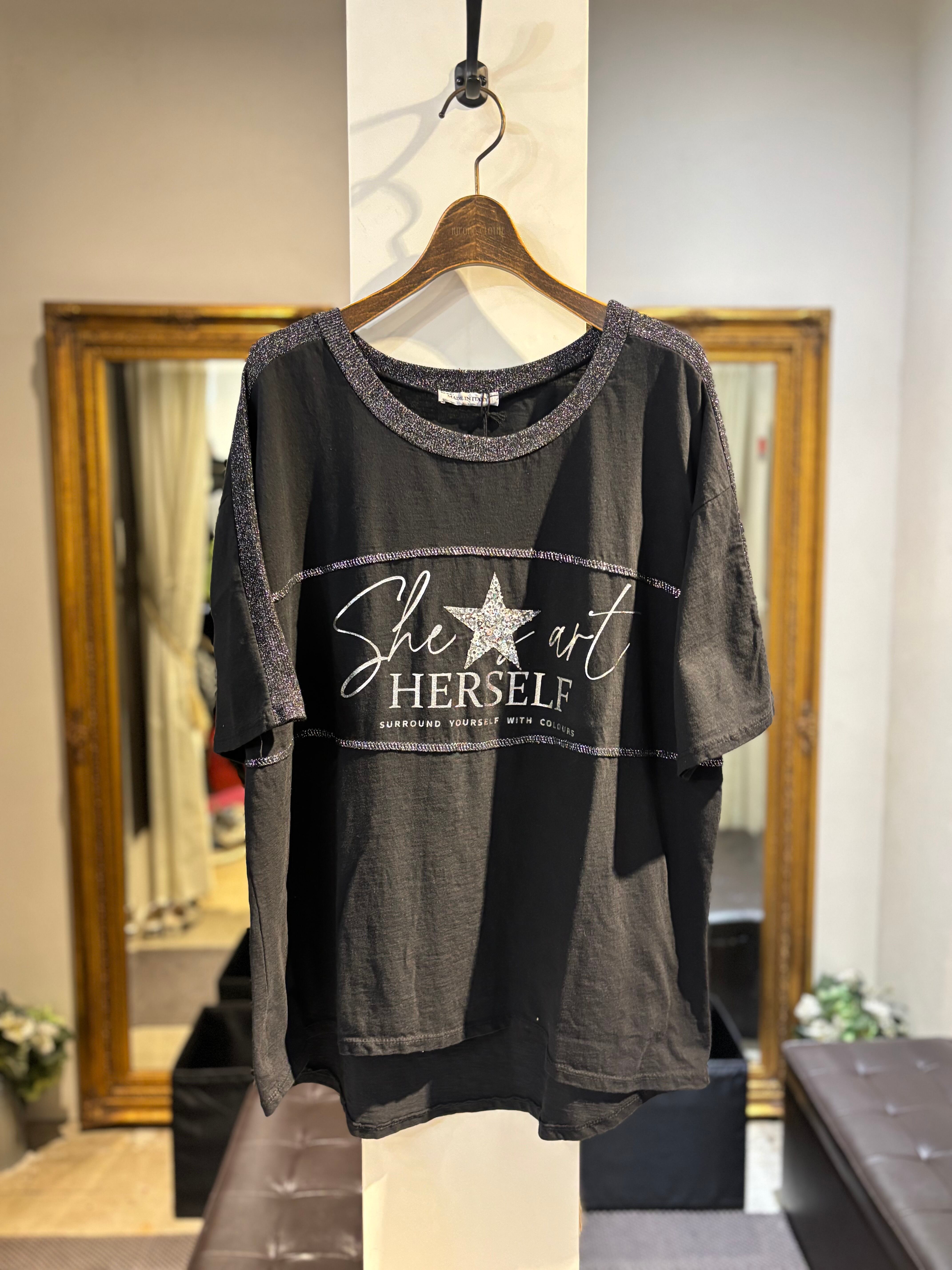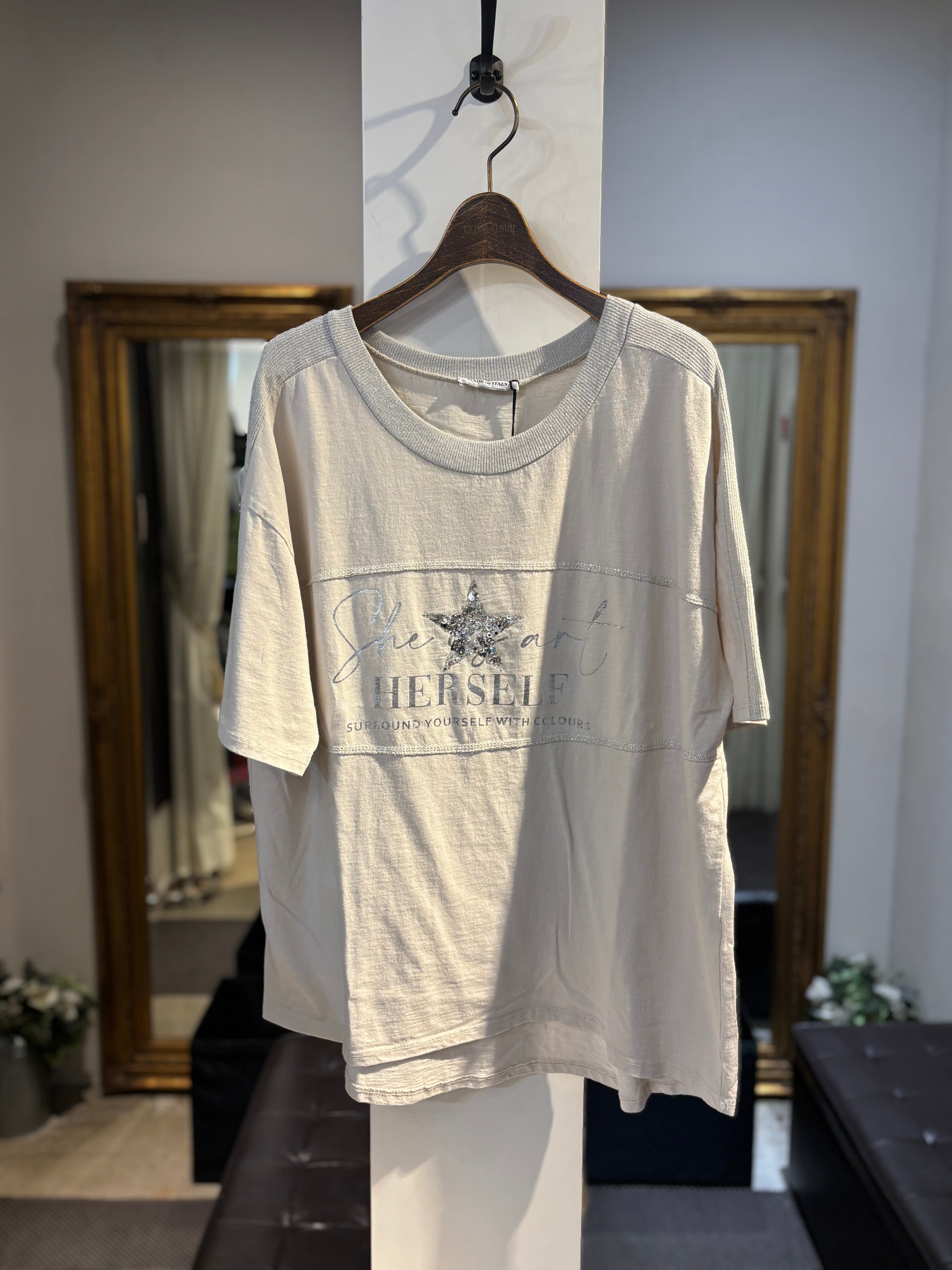大きなロゴとキラキラした星モチーフが施された、オーバーサイズでリラックス感のあるデザインのイタリアインポートTシャツです。
